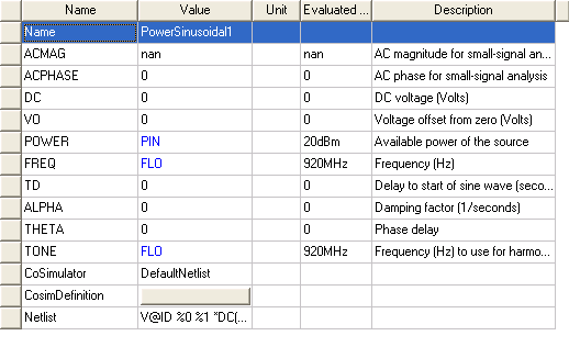 Set the Unit Type to Frequency, the Unit to Hz, and the Value to 920MHz as shown. Click OK. 27. Set the TONE property to FLO as well. This property is used by harmonic balance. The Properties window for the Power Sinusoidal1 source should look like: