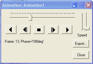 d. Do the following: Accept the defaults for Name (Animation1) and make sure that Phase is selected as the Swept Variable. In the Start, Stop, and Steps boxes, enter 0deg, 360deg, and 40. e. Click OK. The animation begins and a control panel opens:
