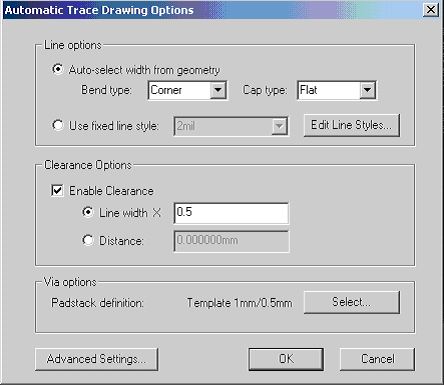 Layout Editor User Guide > Automatic Trace GenerationTo set the configuration options for Automatic Trace Generation, select Auto-Trace Style from the Layout menu. This opens the Automatic Trace Drawing Options dialog: ![]() The following options are available: Auto-select width from geometry will define the line style by bend type, cap type, and the minimum width of the geometry that is being connected. Used fixed line style will define the line style from the named line style, which explicitly gives a width as well as bend and cap types. Enable Clearance causes auto-trace to attempt to keep a minimum distance from all geometry, either as a proportion of line width or as an absolute distance. LineWidth causes auto-trace to attempt to keep a minimum distance, equal to Line Width multiplied by the <number entered>, from all geometry in the layout. Distance causes auto-trace to keep the defined distance from all geometry in the layout. Via Options specifies that the selected via type will be used when vias are placed (which occurs when the trace start and end are not on the same layer). To set additional options, select the Advanced Settings button. This opens the Advanced Auto-Trace Options dialog: ![]() The following options are available: Preferred number of steps to goal is divided into the distance from start to end in order to calculate the step size for the trace grid. In general, smaller step sizes (that is, larger numbers of steps) mean slower performance but better solutions, due to the finer control of the trace path. Note, however, that the step size can never be less than the line width of the generated path. Step size reduction factor per attempt is divided into the step size, if a path avoiding obstacles is not found. Then the algorithm is attempted again. Attempts will continue until the step size is less than the line width or until Maximum number of steps is reached. Maximum number of attempts specifies the upper limit of retry attempts for the trace. Search box size factor is multiplied by the distance from the start to end in order to set the maximum search box size for the trace. As a result, the auto-generated path stays inside the dimensions of the calculated search box. After configuring options for Automatic routing, begin the trace by selecting two pins, edges, or end points and clicking Traces > Automatic routing from the Draw menu. Outputs from the trace are generated and include lines and vias that connect input while avoiding obstacles. Note that vias are added when start/end points do not lie on the same layer, and via positions are chosen so they do not intersect metal. As a result, vias will lie over geometry on ground layers (which are negatives).