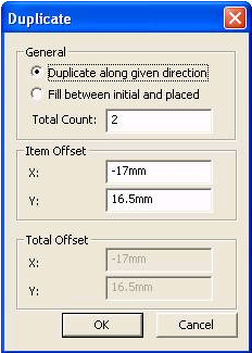 of the right-click menu. 3. Position the copied selection using either the cursor or coordinate bar, then left-click or press Enter. The Duplicate dialog opens: ![]() Use the General radio button to indicate if the duplication is between the selected and placed copy or along their direction. Specify the Total Count, including the selected and placed objects. You can specify an integer value, a variable, or a parameter name. The current value of the variable/parameter is used to perform the duplicate operation. If duplicating along a direction, Item Offset can be edited to change the distance between each. The distance between the selected object(s) and the placed copy is used to initialize the value in Item Offset. You can specify an integer value, a variable, or a parameter name. The current value of the variable/parameter is used to perform the duplicate operation. If filling between objects, Total Offset can be edited to change the distance between the first and last objects duplicated. It is initialized with the distance between the selected object(s) and the placed copy. You can specify an integer value, a variable, or a parameter name. The current value of the variable/parameter is used to perform the duplicate operation. Clicking Ok executes the duplication. The operation is undoable.