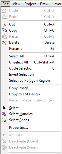 Copy Image — Create a global copy of the selected objects on the clipboard for pasting into a different application. Copy to EM Design — Copy the selected objects to the clipboard and paste into an EM Design. Paste in Place — Paste object to same location, without any X,Y offset/displacement.