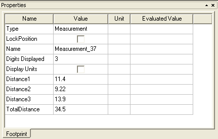 Layout Editor User Guide > Measurement ModeThe Layout editor Measurement Mode allows you to left-click on any two grid-points in order to define a segment and display the linear distance between its endpoints. Measurements are displayed as property displays on the layout. ![]() Measurements and their properties are also displayed as values in the Properties window. ![]() Type describes the value type, which is Measurement LockPosition controls the Position Locking of the measurement in the layout. The default is position unlocked. Name describes the name value, which is Measurement_45 Digits Displayed controls the number of significant digits that are displayed, and is controlled by the Measurement Distance Displays area of the Object tab of the Layout Options dialog. The default is 3 significant digits. Display Units controls whether measurement distances are displayed with the Project's current units, as defined by the Default Units tab of the General Options dialog for the Project. The default is units undisplayed. Start, End, Delta, and Angle are editable number properties related to position which will change the measurement as it exists in the layout. TotalDistance is a readonly text property that matches what is displayed on the layout.