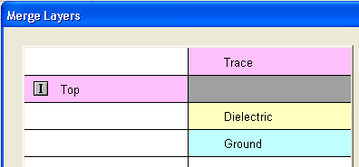 The dialog shows the object layers on the left and the design layout layers on the right. In the example above, the object has just one layer (Top) while the layout has three layers (Trace, Dielectric, and Ground). When an object layer is adjacent to a layout layer (the Top and Trace layers in the example above), the M button is displayed, and the layers will be merged. When an object layer is adjacent to a blank cell on the layout, the I button is displayed, and the object layer will be inserted:
