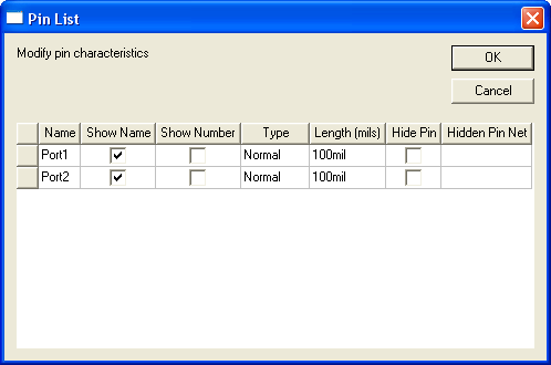 The available pin properties include: Name — This editable cell displays and sets the pin name. To specify or change the name of a pin, click in the Name cell for that pin, type the name, and then press Enter or click in another cell. Show Name — This check box controls visibility of the pin name in the schematic editor. For a new pin, it is unchecked by default. Show Number — This check box controls visibility of the pin number in the schematic editor. For a new pin, it is unchecked by default. Type — This drop-down list sets the pin type, the options for which include Normal (the default), ANSI In, ANSI Out, and Zero Length. To change a pin’s type, click in its Type cell, and then click the desired option. Length — This editable cell sets the length of the pin stem (the graphical line associated with the pin port symbol). By default, new pins have a pin stem length of 10. To change the length of a pin, click in its Length cell, type a new value, and then press Enter or click in another cell. Hide Pin — This check box controls whether or not a pin is visible in the schematic editor. For new pins, it is unchecked by default. Hidden Pin Net — This cell, editable when Hide Pin is checked, specifies the net (the circuit node) to which a pin will be connected if it is hidden. To specify a net, click in the Hidden Pin Net cell, type a net name, and then press Enter or click in another cell.