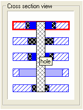 Displays all the definition layers and their pads from a side view. The selected layers are highlighted. Tool tips indicating layer/hole/plating/pad appear when the mouse hovers over one of these shapes.