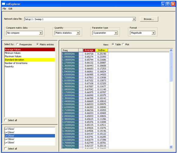 Network Data Explorer > Displaying Individual Statistics for All Frequencies1. Select Matrix statistics in the Quantity control field. 2. Select Matrix entries in the data selection pane at left. 3. Select Table in the data view pane at right. 4. Choose the statistics and variations to display.