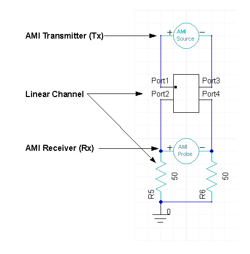 The Algorithmic Modeling Interface simulates user-specified transmitter and receiver models, furnished as C-interface compiled libraries, over a linear channel. The AMI Specification was published in the IBIS Specification (See AMI Analysis References).