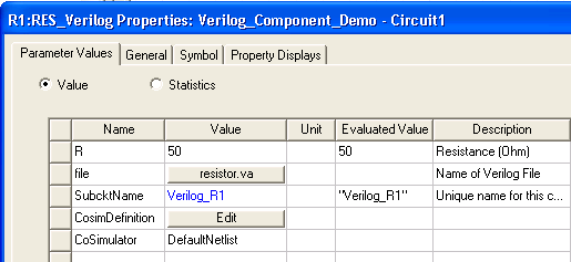 11. Add any additional parameters required as input variables in the Verilog model you are accessing. The resistor model in our example uses only variable R for the resistance. This property is already in the Nexxim resistor component. When the component is instantiated in the schematic, the user sets these parameters to the desired values. The instance values are passed to the Verilog model during simulation of the circuit.