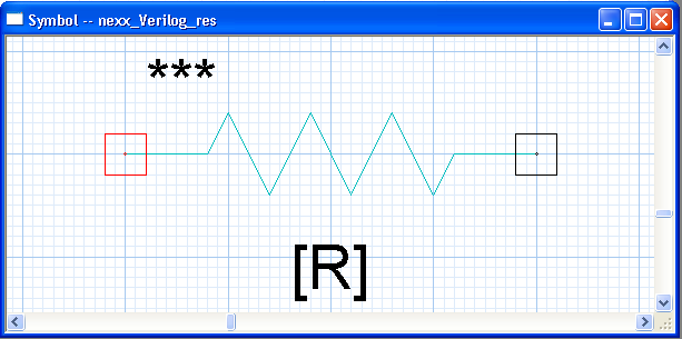 The first step is to create a schematic symbol to represent the Verilog component. A symbol consists of a graphic design with pins for the electrical nodes that connect the component to the circuit. In this example the Verilog symbol is a copy or “clone” of a Nexxim resistor symbol.