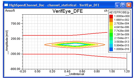 Figure 12. VerifEye analysis of channel with 4-tap DFE. Weights automatically calculated for DFE by Nexxim are (0.10439, 0.05148, 0.03139, and 0.02215) Decision-feedback equalization is set up in the Eye Probe, using the DFE_TAPS, DFE_LOCS, DFE_WEIGHTS, DECISION_HIGH, DECISION_LOW, and DECISION_THRESHOLD parameters. HFSS视频教程 ADS视频教程 CST视频教程 Ansoft Designer 中文教程 |