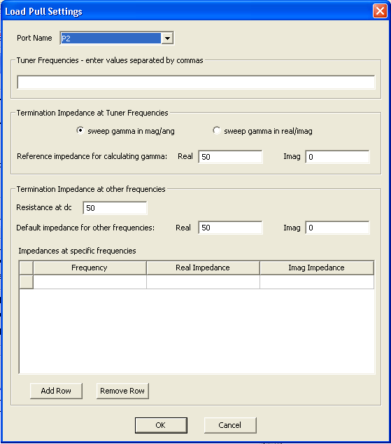 •  Set the termination impedances to use at DC and at frequencies other than the tuner frequencies. In addition to a default, you can set specific impedances for particular frequencies in the table. Use the Add Row and Remove Row buttons to manipulate the table rows.