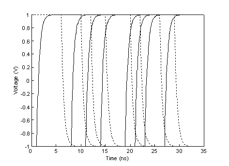 Figure 4: Intermediate QuickEye waveforms for the RC example. Rising edges are solid; falling edges are dashed. Summing these transitions creates the waveform in Figure 2.