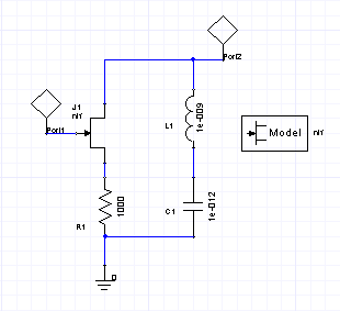 5. To place a device in the schematic design, double-left-click the name of the device, then left-click in the Schematic Editor window. Place the component as desired, then double left-click to end the placement process. 6. An active device such as a JFET requires a device model to specify the fabrication parameters. Depending on the design, several devices can reference the same model, or each device may require a separate model. 7. Here is a design using one level 1 JFET and the corresponding level 1 JFET model.
