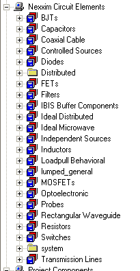 Nexxim Simulator > Selecting Devices and Models in the Schematic EditorWhen you are creating a design in the Schematic Editor, you select component devices from the Components menu. Here is a brief review of the procedure. 1. Open Designer. From the File menu, select New to create a new Project. Highlight the project name (by default, Projectn), and rename it as desired. 2. Right-click on the project name, then select Insert>Insert Circuit Design. The Schematic Editor opens for you to create your design. 3. Click on the Components tab at the bottom of the Project window. The Components menu opens: