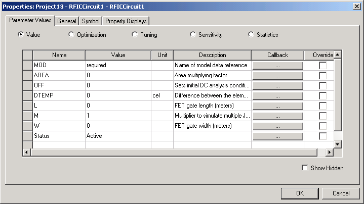 9. Make sure the Value radio button is selected. Enter a model name for the value of the MOD parameter. The model name connects this instance of the JFET to the corresponding JFET model. Press Return to delimit each entry and move down to the next parameter. For each parameter that is changed or set, the Override field at the right of the window is checked. Click OK when all instance parameters are set as desired. 10. Double left-click on the JFET model. Use the Properties window to assign the model name, using the same name as the one given for the JFET instance MOD parameter. In the example circuit above, the model name is “jfet1.” Click OK when all model parameters are set as desired. 11. Repeat steps 4 through 10 as many times as needed to place all components in the circuit and assign instance and model parameter values. HFSS视频教程 ADS视频教程 CST视频教程 Ansoft Designer 中文教程 |
