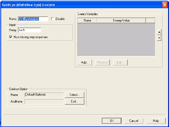 3. Type an Analysis Name (or accept the default name, for example “VerifEyeAnalysis”). 4. For most simulations, leave the Disable box unselected (the default setting). Selecting this box lets you store multiple solution setups for later use. 5. The Input panel controls the statistical eye analysis. Specify the Delay to be applied before the step response is applied (default is 0 seconds) Run missing step response allows simulation to proceed when an External Step Response component is present in the design but no step response data file can be found. 6. To add a sweep, locate the Sweep Variable area in the VerifEye Analysis dialog box. In the Sweep Variable area, click Add, and the Add/Edit Sweep dialog box appears. In the Variable list, select Temp or the name of a variable (when a variable has been defined for the design), and then select one of the following: Single value, Linear step, Linear count, Decade count, or Octave count. Type the sweep values into the Value text box (for Single value), or into the Start, Stop, and Step text boxes (for Linear, Decade, or Octave count), and make sure that the appropriate units are selected for each. For details on sweeps, see Variable Sweep. Click Add, and then click OK to close the Add/Edit Sweep dialog box. The VerifEye Analysis dialog box reappears. 7. Optionally, use the fields in the Solution Option panel to add VerifEye/QuickEye options. Click the Select button on the Name field to open the Select Solution Options dialog. Click New to create a new option set. The Solution Options dialog box appears.