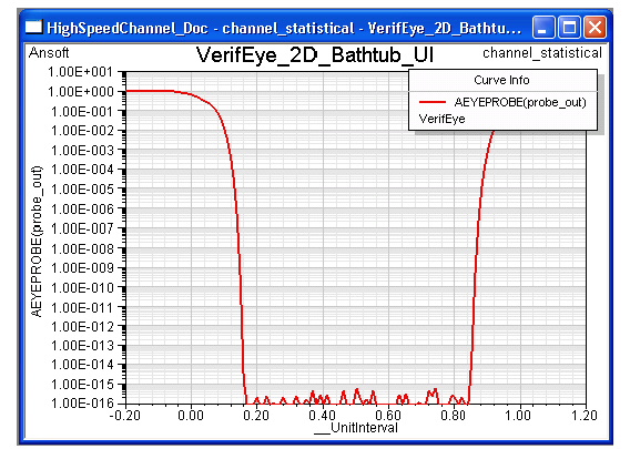 •  Click the checkbox Use midpoint of and the radio button Amplitude. Click Apply Trace. The report changes to show the BER (the AEYEPROBE axis in the example) plotted against displacement in the unit interval.