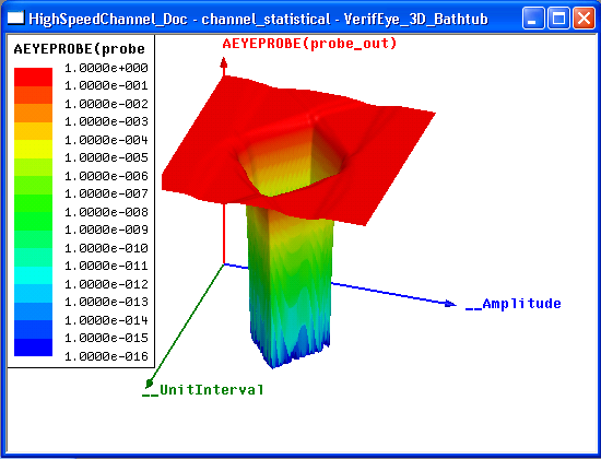 The values for AEYEPROBE are the bit error rates using logarithmic scaling. Amplitude represents the voltage transitions and UnitInterval is the location of the data relative to the unit interval.