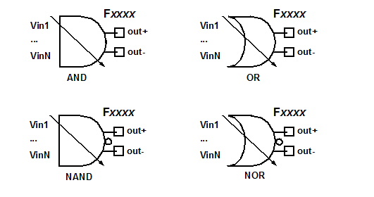 ![]() CCCS Gate Netlist FormatThe format for an N-input AND gate CCCS is: Fxxxx out+ out- [CCCS] AND(N) vin1 ... vinN minval1 outval1 ... minvalK outvalK [DELTA=val] [TC1=val] [TC2=val] [SCALE=val] [M=val] [ABS=0|1] The format for an N-input NAND gate CCCS is: Fxxxx out+ out- [CCCS] NAND(N) vin1 ... vinN minval1 outval1 ... minvalK outvalK [DELTA=val] [TC1=val] [TC2=val] [SCALE=val] [M=val] [ABS=0|1] The format for an N-input OR gate CCCS is: Fxxxx out+ out- [CCCS] OR(N) vin1 ... vinN minval1 outval1 ... minvalK outvalK [DELTA=val] [TC1=val] [TC2=val] [SCALE=val] [M=val] [ABS=0|1] The format for an N-input NOR gate CCCS is: Fxxxx out+ out- [CCCS] NOR(N) vin1 ... vinN minval1 outval1 ... minvalK outvalK [DELTA=val] [TC1=val] [TC2=val] [SCALE=val] [M=val] [ABS=0|1] out+ and out- are the nodes of the current output. The entry CCCS is the default for the F element type. vin1 ... vinN are the voltage sources through which the multiple control current inputs flow. The input voltage sources must be defined elsewhere in the netlist. The number of input sources (N) in the list must be the same as the value specified for AND(N), NAND(N), OR(N), or NOR(N). For current-controlled sources, N must be in the range 2£N£4.