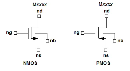 ![]() BSIM3v3 MOSFET Instance Netlist SyntaxThe syntax for an Ansoft Enhanced BSIM3v3 (HSPICEÔ Level 49) or Berkeley standard BSIM3v3 (HSPICEÔ Level 53) MOSFET instance is: Mxxxx nd ng ns [nb] modelname [[L=]length] [[W=]width] [AD=val] [AS=val] [PD=val] [PS=val] [NRD=val] [NRS=val] [MULU0=val] [MULUA=val] [MULUB=val] [M=val] [DELVTO=val] [DTEMP=val] [SCALE=val] nd is the drain node, ng is the gate node, ns is the source node, and nb is the bulk or substrate node of the MOSFET. modelname is the name of a Level 49 or 53 MOSFET model defined in a .MODEL statement elsewhere in the netlist. When the option WL is in effect (on the .OPTION statement), the syntax becomes: Mxxxx nd ng ns [nb] modelname [width] [length] [AD=val] [AS=val] [PD=val] [PS=val] [NRD=val] [NRS=val] [MULU0=val] [MULUA=val] [MULUB=val] [M=val] [DELVTO=val] [DTEMP=val] [SCALE=val]