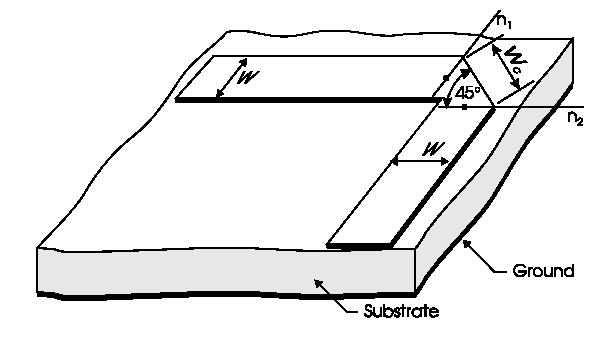 n1 and n2 are the names of the nodes attached to the mitered bend. The entry COMPONENT=optimally mitered_bend identifies the element as a mitered bend. The entry SUBSTRATE=substrate_name identifies the microstrip substrate model name selected for the design (see Selecting a Microstrip Substrate). See the Microstrip (MS) Substrate for information on this substrate type.