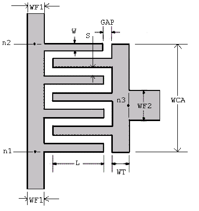 5. The terminal strip width WT can be set to zero. In this case, the user must set WF1=WF2=WCA. The response will not include the effects of the terminal strips and the steps. The user must add these effects using TRL and STEP elements 6. When the number of fingers N is odd, the model assumes that (N+1)/2 fingers are connected to node 1, while (N-1)/2 fingers are connected to node 2 (see dimensional diagram above). 7. The model takes into account the capacitance at the end of each finger and the small strips of length GAP at the beginning of each finger (outside the overlap region). References[1] J. Hobdell, “Optimization of Interdigital Capacitors,” IEEE Trans, on MTT, Sep 1979, pp. 788-791. [2] X She, and Y Chow, Interdigital Microstrip Capacitor as a Four-Port Network,”IEEE Proc. Pt. H, June 1986, pp. 191-197.