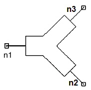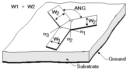 Netlist FormatAn instance of a Y-junction has the following netlist syntax: AYJUNxxx n1 n2 n3 W1=val W2=val ANG=val COMPONENT=yjunction SUBSTRATE=substrate_name n1, n2, and n3 are the names of the nodes attached to the junction. The entry COMPONENT=yjunction identifies the element. The entry SUBSTRATE=substrate_name identifies the microstrip substrate model name selected for the design (see Selecting a Microstrip Substrate). See the Microstrip (MS) Substrate for information on this substrate type.