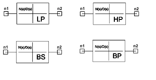 The netlist would specify: A22 1 2 FILTER_TYPE=4 FC=80e6 BW=101e4 Notes1. The element is specified using a transfer function given as the ratio of two polynomials in the complex variable s. The bold brackets for the NUMER and DENOM entries are required. The function of the device is expressed as: The transfer function H(s) is specified by giving the coefficients: