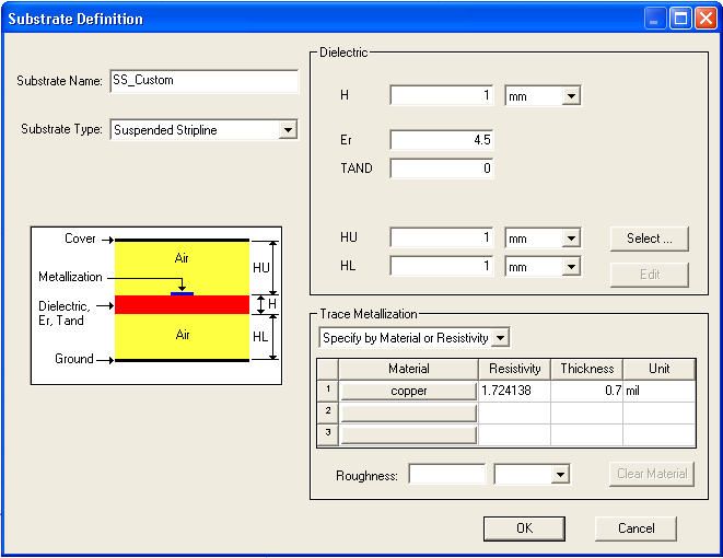Nexxim Simulator > Creating a Custom Suspended Stripline SubstrateTo create a suspended stripline substrate definition, open the Nexxim design icon (“Nexxim1” for example), then right-click on the Add Reference Data field. Select Add Substrate Definition from the pulldown. The Substrate Definition window opens. Specify the name of your new substrate (the example below uses the name “SS_Custom”):