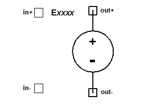 ![]() Linear VCVS Netlist FormatThe format for a linear voltage-controlled voltage source (VCVS) is: Exxxx out+ out- [VCVS] in+ in- [GAIN=]gain [MAX=val] [MIN=val] [SCALE=scale] [TC1=val] [TC2=val] [ABS=0|1] out+ is the positive node and out- is the negative node of the voltage source. The entry VCVS is the default for the E element type. in+ and in- are the positive and negative nodes for the control voltage. The functional equation for the linear VCVS is: V(out+) - V(out-) = GAIN ´ (V(in+) -V(in-)) ´ SCALE ´ (1 + DT ´ (TC1 + DT ´ TC2)) If the result is less than MIN, V(out+) - V(out-) = MIN If the result is greater than MAX, V(out+) - V(out-) = MAX