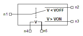 E1 (n1 n2 n3 c1 0) vspdt von=1 Notes1. In normal operation, VON is greater than VOFF. Output node n2 is selected whencontrol voltage VC is less than or equal to VOFF, and output node n3 is selected when VC is greater than or equal to VON. 2. In inverted operation, VOFF is greater than VON. Output node n2 is selected when VC is greater than or equal to VOFF, and output node n3 is selected when VC is less than or equal to VON. VSPDT Model EquationsG1 is the conductance betrween node 1 and node 2. G2 is the conductance between node 1 and node 3. If ((VON >=VOFF && VC >= VON) || (VON < VOFF && VC <= VON)):