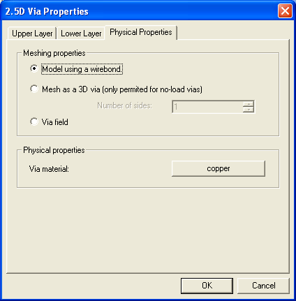 Physical Layer Properties 8. Click the Physical Properties tab and do the following: ![]() a. Model using a wirebond — Vias are modeled as a wirebond; a single wire element connecting the start and end of the via and intersecting all layers in between. This modeling method is recommended when the diameter of the via is electrically small since it is highly accurate and efficient. Vias used in designs that contain 3D objects will automatically be modeled as two dimensional ribbons. b. Mesh as a 3D Via — Vias are modeled as a ribbon (sides < 3) or a true three-dimensional solid, depending on the number of sides specified. This modeling method (with sides > 2) can be used for vias of any diameter, but may be inefficient if the via diameter is small. — Number of sides: Defines the n-sided prism to use when meshing the via. c. Via field — For a large number of vias filling a region, the Via field option simplifies the field by thinning the vias within each via cluster on a layer. A cluster is defined as a group of vias with roughly the same inter-via spacing. Thinning does not alter connectivity; all geometry connected by a via remains connected. —