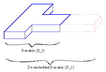 The S-matrix, S_1, describes the behavior of the structure that was modeled. The de-embedded S-matrix, D_1, describes the behavior of a structure created by subtracting or adding a length of lossless transmission line to the structure that was modeled. It is computed by phase rotating the S-matrix inward toward or outward away from the structure by the specified length at each port. To shift the reference plane of the structure, the S-matrix of the modified structure can be calculated using the following relationship: