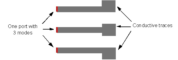 HFSS and Planar EM Simulators > Gap SourcesGap sources represent places in the geometry through which excitation signals enter and leave the structure. The following figure demonstrates the surfaces that have been defined as ports on the edges of conductive traces. Edges on multiple conductors may be defined as a single port with one mode for each conductor. This example has one port with three modes: