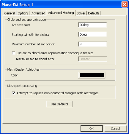 HFSS and Planar EM Simulators > Planar Setup: Advanced Meshing TabClick the Advanced Meshing tab of the Add Planar EM Solution Setup dialog to access the following settings. ![]() Circle and arc approximation: circles and arcs must be replaced with straight edge approximations before meshing. There is no attempt to match areas; points are simply introduced on the original arc at the locations specified by the following parameters. Arc setup size: the angular interval below which mesh points are added. Starting azimuth for circles: specifies the location of the first mesh point or circles. Maximum number of arc points: the maximum number of mesh points on a given arc segment. Use arc to chord error approximation technique for arc: the resulting straight edge approximation will not deviate from the original arc by more than the specified error. — Maximum arc to chord error: maximum distance permissible between a straight edge approximation (the chord) and the original arc. Mesh Display Attributes: controls the mesh overlay in Layout. Color: the mesh is drawn in the specified color; in Layout3D the layer color is used for the mesh. Mesh post-processing: Attempt to replace non-horizontal triangles with rectangles: the PlanarEM solver operates more efficiently when there are no non-horizontal triangles. With this option set, the mesher will attempt to resolve all non-horizontal triangles that form a perfect rectangle into rectangular mesh elements.