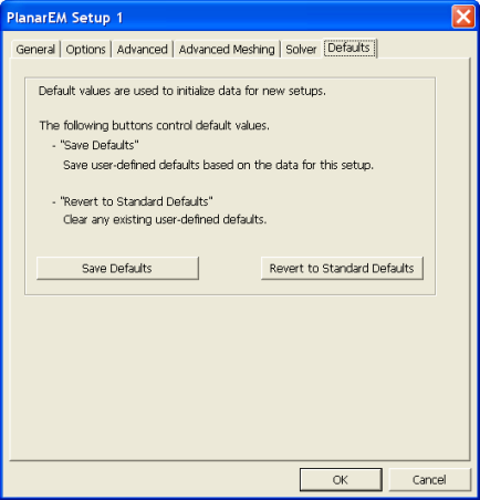 HFSS and Planar EM Simulators > Planar Setup: Defaults TabClick the Defaults tab of the Add Planar EM Solution Setup dialog to access the following settings. ![]() Use the Defaults tab of the PlanarEM Setup dialog to: Save Defaults: Save user-defined defaults based on the data for this setup (for all tabs). Revert to Standard Defaults: Clear any existing user-defined defaults (for all tabs).