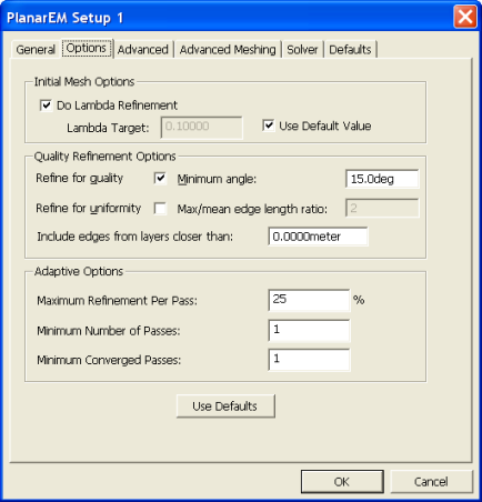 HFSS and Planar EM Simulators > Planar Setup: Options TabClick the Options tab of the Add Planar EM Solution Setup dialog to access the following settings. ![]() Initial Mesh Options: options that define the initial mesh (before adaption). Do Lambda Refinement: mesh edges are reduced to a length equal to the wavelength scaled by the Lambda Target. Lambda Target: the fraction of the wavelength that determines the refined triangle edge length, e.g. if the value is '0.1' then an edge length of 0.1* is used as the refinement target. Use Default Value: if checked, a default lambda target value is used otherwise the user may enter any value greater than zero. Typically the value is a fraction less than 1. Quality Refinement Options: refine for triangle quality - e.g. no sharp angles, uniform size. Refine for quality: adjust triangles until there are no angles less than the minimum; this may require the insertion of many triangles in the neighborhood of a sharp angle. — Minimum angle: adjust triangles until no angle is less than this minimum. Refine for uniformity: adds additional points to the mesh in order to limit long edges if the ratio between the average and maximum edge lengths exceeds the desired ratio. — Max/mean edge length ratio: the maximum permissible ratio between the maximum triangle edge length and the mean edge length. Include edges from layers closer than: geometry edges from layers closer (in elevation) that this distance is pulled into the layer currently being meshed (providing they don't fall on an existing edge). Simulation accuracy typically benefits from this operation. Adaptive Options:allows you to specify the following adaption option settings. Maximum Refinement Per Pass: determines how many tetrahedra are added at each iteration of the adaptive refinement process. The tetrahedra with the highest error will be refined. The value is a percentage. Minimum Number of Passes: the maximum number of mesh refinement cycles that you would like the solver to perform. This value is a stopping criterion for the adaptive solution; if the maximum number of passes has been completed, the adaptive analysis stops. If the maximum number of passes has not been completed, the adaptive analysis will continue unless the convergence criteria are reached. Minimum Converged Passes: an adaptive analysis will not stop unless the minimum number of converged passes has been completed. The convergence criteria must be met for at least this number of passes before the adaptive analysis will stop.