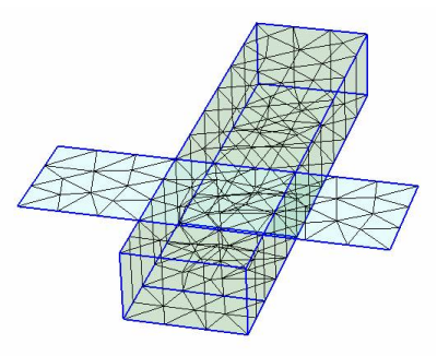 HFSS and Planar EM Simulators > Precedence PrioritizingWhere polygons from different layers/materials overlap, the mesher decides on the material in the area of intersection based on the following rules: 1. For polygons with precedence numbers, the polygon with lower precedence takes priority over those polygons with higher precedence. 2. If the mesher cannot resolve the priority using the precedence attribute, it considers conductivities. The polygon with the higher conductivity takes priority over those polygons with lower conductivity. 3. If conductivities are the same, the stackup index is used. Objects higher in the stackup table (i.e. with a lower stackup index) take precedence over objects lower in the stackup table (i.e. with a higher stackup index). For example, in the following illustration the blue rectangle (a thin metal) has a lower precedence value than the green rectangle (a thick metal), so its material (blue) takes priority where the two come in contact. ![]()