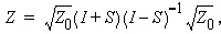 S is the nxn generalized S-matrix. I is an nxn identity matrix. Z0 is a matrix with the characteristic impedance of each port as a diagonal value. The renormalized S-matrix is then calculated from Z using this relationship: