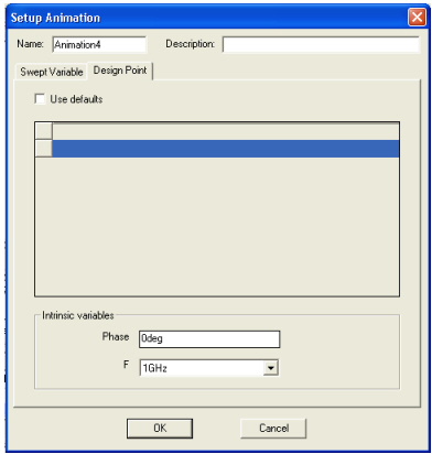 Generating Reports and Postprocessing > Changing the Design PointCalculating frames for an animation is equivalent to re-simulating the planar design. You can specify design point parameters for the animation calculations that are different from the ones used in the original simulation. On the Animation Setup dialog, select the Design Point tab and deselect the Use defaults option. The following fields are displayed: