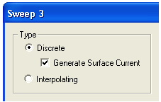 Generating Reports and Postprocessing > Overlaying Surface Currents on a 3D ViewSurface currents calculated as the results of a Planar EM simulation can be displayed as overlays on the 3D viewer. 1. To ensure that the surface current information is generated, the sweep setup must specify a Discrete frequency sweep, and the Generate Surface Current option must be enabled (checked):
