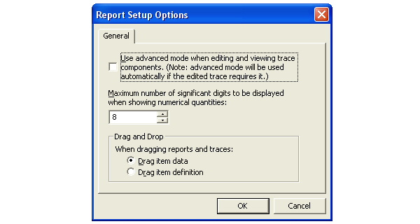 2. Use the checkbox to specify whether to use advanced mode when editing and viewing trace components. (Advanced mode is used automatically if the trace requires it.) 3. Use the text-box/pulldown-menu to specify the number of significant digits to use when displaying numeric values. 4. Specify the drag and drop behavior by clicking the radio button: Drag item data Drag item definition