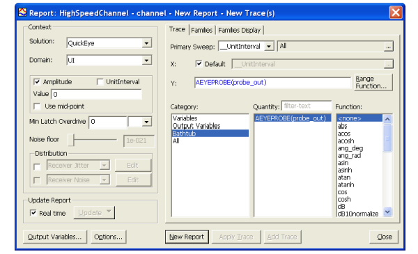 Generating Reports and Postprocessing > Unit Interval and Amplitude Values for Bathtub CurvesYou can specify values for the Unit Interval or Amplitude while plotting bathtub curves for a QuickEye/VerifEye analysis. The controls allow you to choose between two checkboxes for Amplitude and UI. ![]() When either box is checked, the edit window is enabled, allowing you to enter an Amplitude or UI value at which to see the bathtub curve. Designer will then interpolate the data to plot a bathtub curve at that Amplitude or UI. A midpoint checkbox can also be enabled, instead of specifying a value for the Amplitude or UI. By default, the Amplitude and UI checkboxes are unchecked, and the midpoint of Amplitude is used as the default sweep value for the Amplitude.