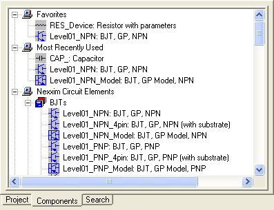 Schematic Editor > Favorites and Most Recently Used ComponentsWhen the Schematic Editor is the active window, the Components tab in the Projects window keeps track of the components that have been placed most recently. In addition, you can create a Favorites list of components you use frequently.