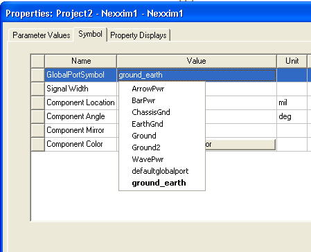 2. Select the Symbol tab and then left-click on the Value field for the GlobalPortSymbol to display a pulldown with the choices for symbols.