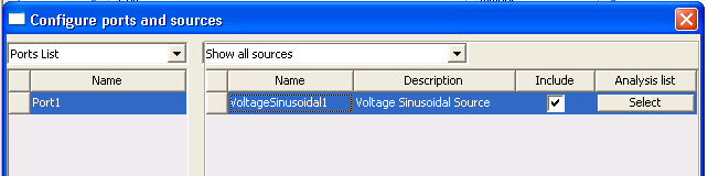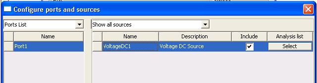 Click in the Name field to assign a name other than the default. For Nexxim port voltage sources, you can specify noise data by clicking on the button in the row for the noise property. See Adding Noise Data to a Nexxim Port Source for details. When all data for the port voltage source have been entered, click OK. The Select Analysis dialog opens. Use the checkboxes to associate the source with one or more analyses. The Configure ports and sources dialog box now shows the new source.