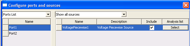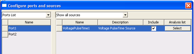 When all time points and values have been entered, click OK to return to the Properties window. When all parameters have been entered, click OK. The Select Analysis dialog opens. Use the checkboxes to associate the source with one or more analyses. The Configure ports and sources dialog box now shows the new source.