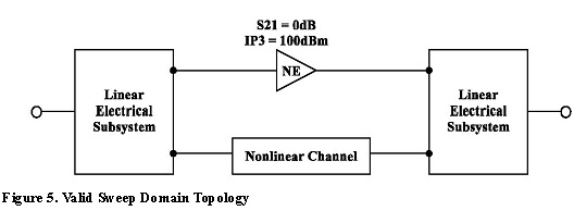 System Simulator > Topology Restrictions for the Sweep Domain1. A valid topology consists of arbitrary linear electrical topologies interconnected by an arbitrary number of cascaded nonlinear electrical channels (containing nonlinear 2-port data, amplifier, mixer and/or frequency multiplier). An example of an invalid topology is shown in Figure 4. This topology would become valid with the added nonlinearity in Figure 5.