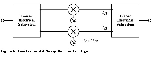 2. Only electrical components are allowed for the frequency-based sweep domain. In addition, linear/nonlinear electrical subsystems are allowed. 3. For each input frequency tone, each node inside the system must have only a single frequency tone present (e.g., multiple mixer paths may not lead to different frequencies at a given node in the system. This condition should yield an analysis error message). Figure 6 below represents an invalid topology for sweep domain analysis.
