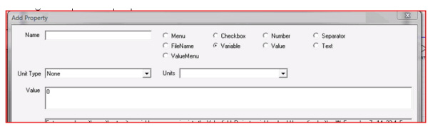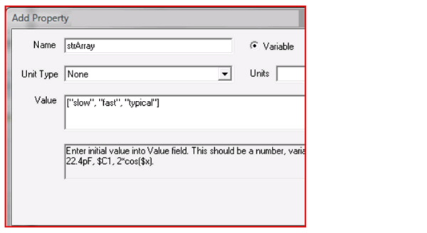 Variables in Designer > Defining Array VariablesYou can define array variables that contain numbers or strings. Number array variables can be used in component property expressions, while string array variables can be used in certain component property values. To define an array variable, first use either of the following methods to define either a Local variable or a Project variable: Defining Local Variables — To define a local variable, in the Project menu, right-click the project name and select Project Variables. Defining Project Variables — To define a project variable, in the Project menu, right-click the design name and select Design Properties. This will open a Properties dialog. After opening a Properties dialog to define either a local variable or a project variable, click Add, and the Add Property dialog opens: